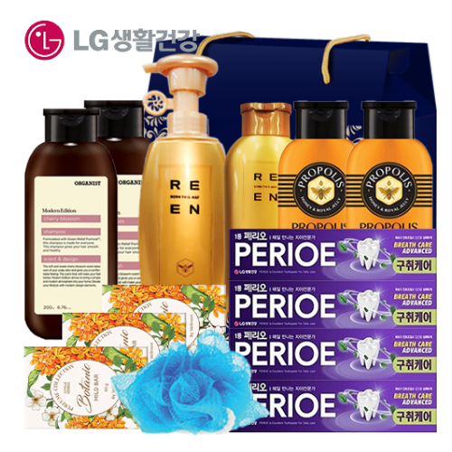 LG생활건강 리엔 로열젤리 샴푸 400ml(1입), 모던에디션 체리블라썸 샴푸 200ml(2입), LG생활건강 리엔 로열젤리 린스 200ml(1입), 벨먼 프로폴리스 바디워시 200ml(2입), 온더바디 비누 80g(3입), 페리오 치약 100g(4입), 샤워볼 1P(1입)